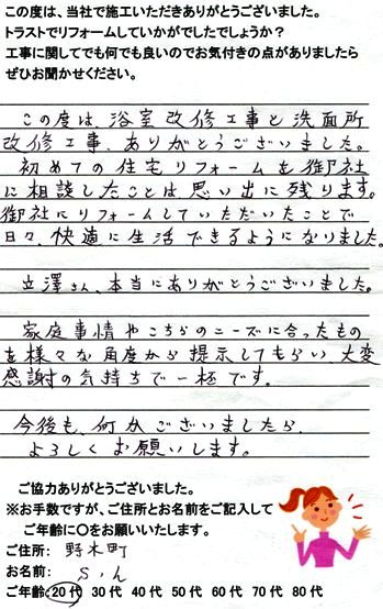 ・リフォーム物件が遠隔地であったが、フットワークよく対応していただいた。今後共、よろしくお願い致します。