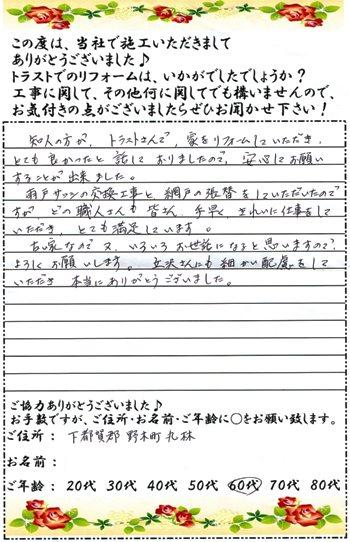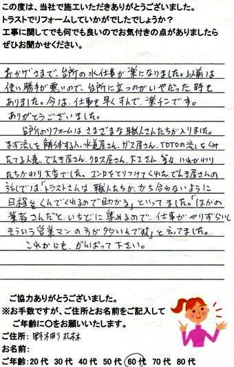 又、別の業者でのリフォームをしてもらったけれども不十分の為、アドバイスを頂き、その上、ホームセンター迄行って頂き、不十分の品を購入して頂きまして、ほんとうに有り難う御座いました。
